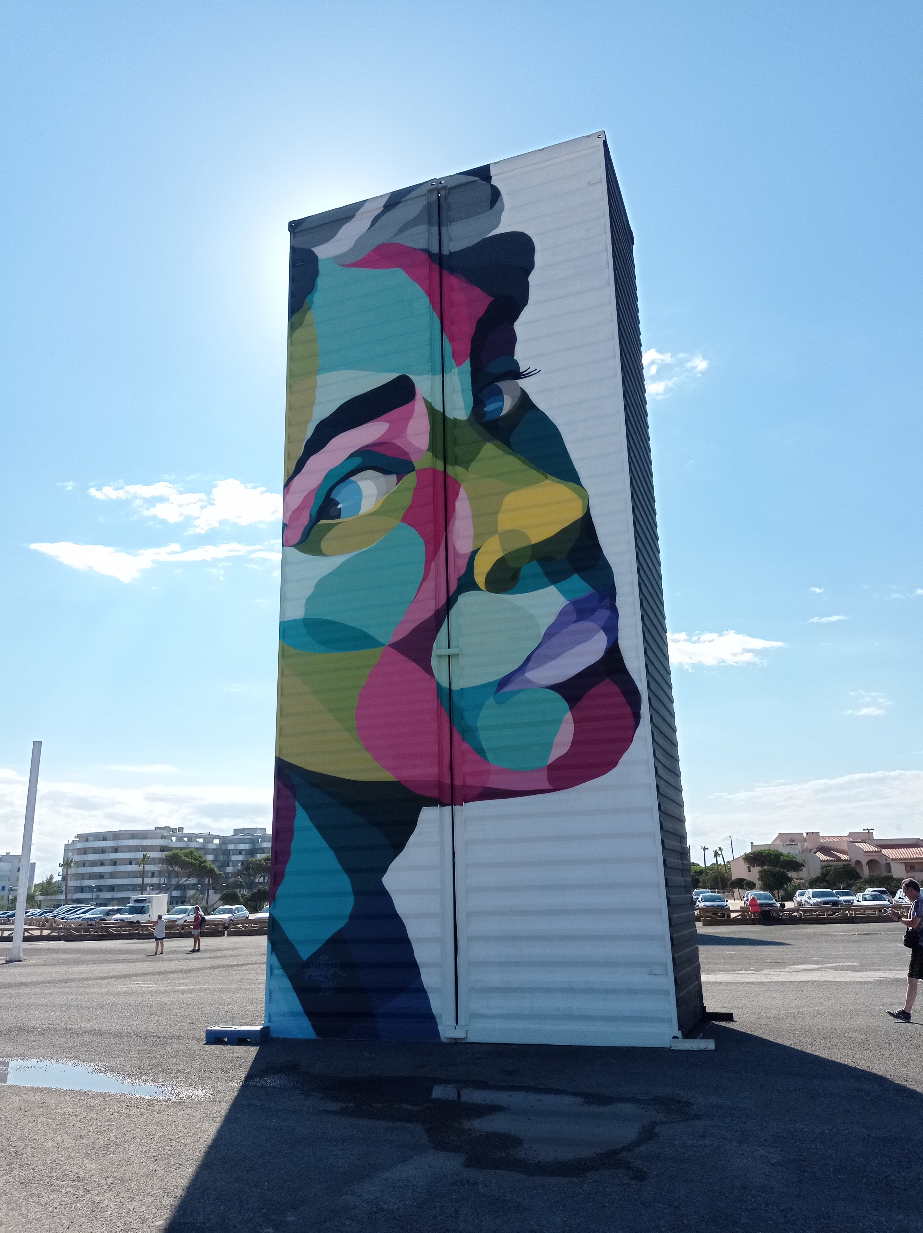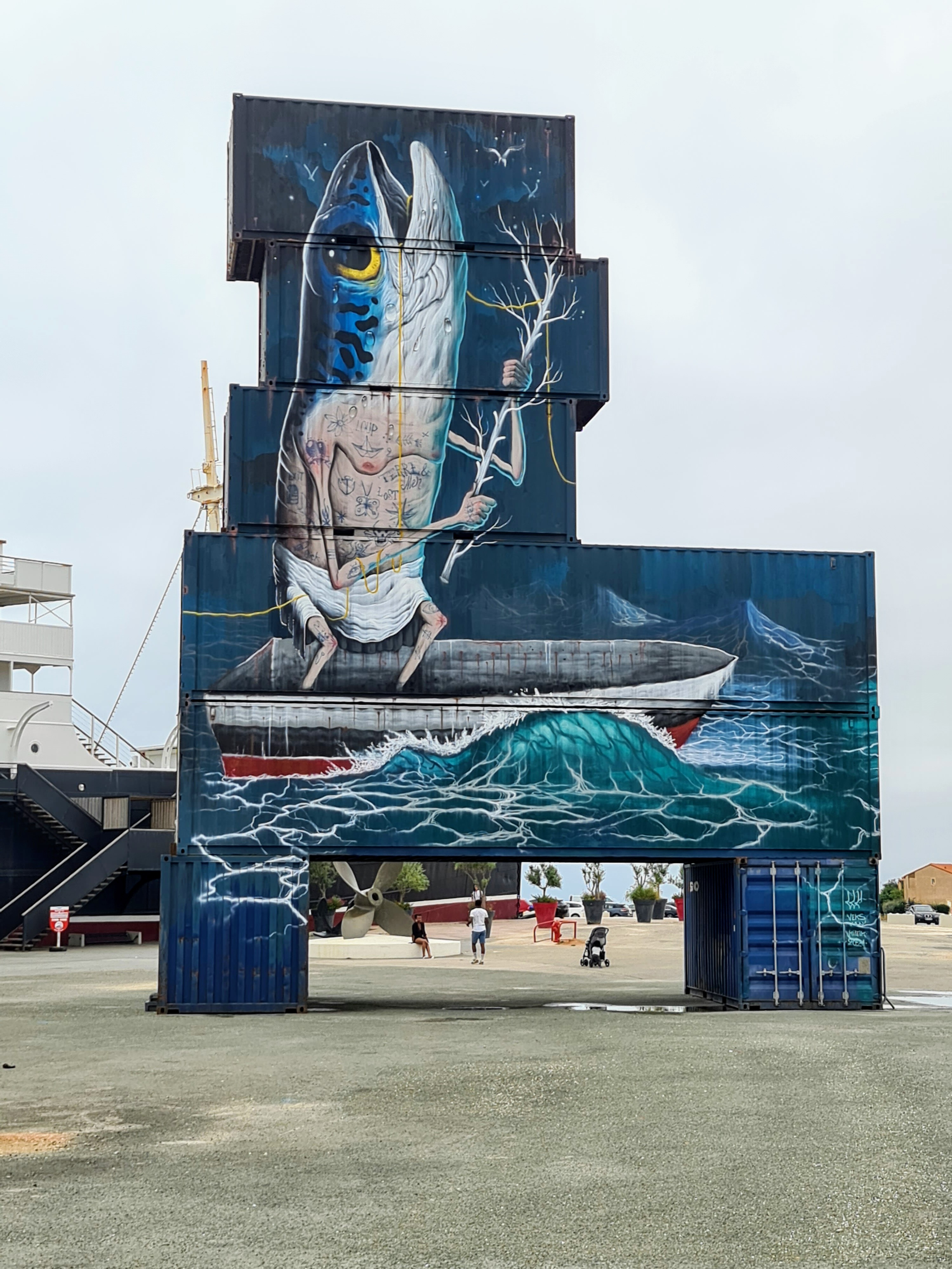 Posté le 05/09/2021 à 20:30" France - Languedoc-Roussillon. Le navire est en fait un musée. Mais l'extérieur vaut aussi le détour. Sympa pour les photos. La place devant le Lydia est désormais dédiée au street art. Le musée d'art de la rue Barcarès. Art sur conteneurs maritimes. Depuis le fauteuil, on peut observer quelques œuvres d'art en métal et un dessin spécial au sol. Ça vaut vraiment le coup."