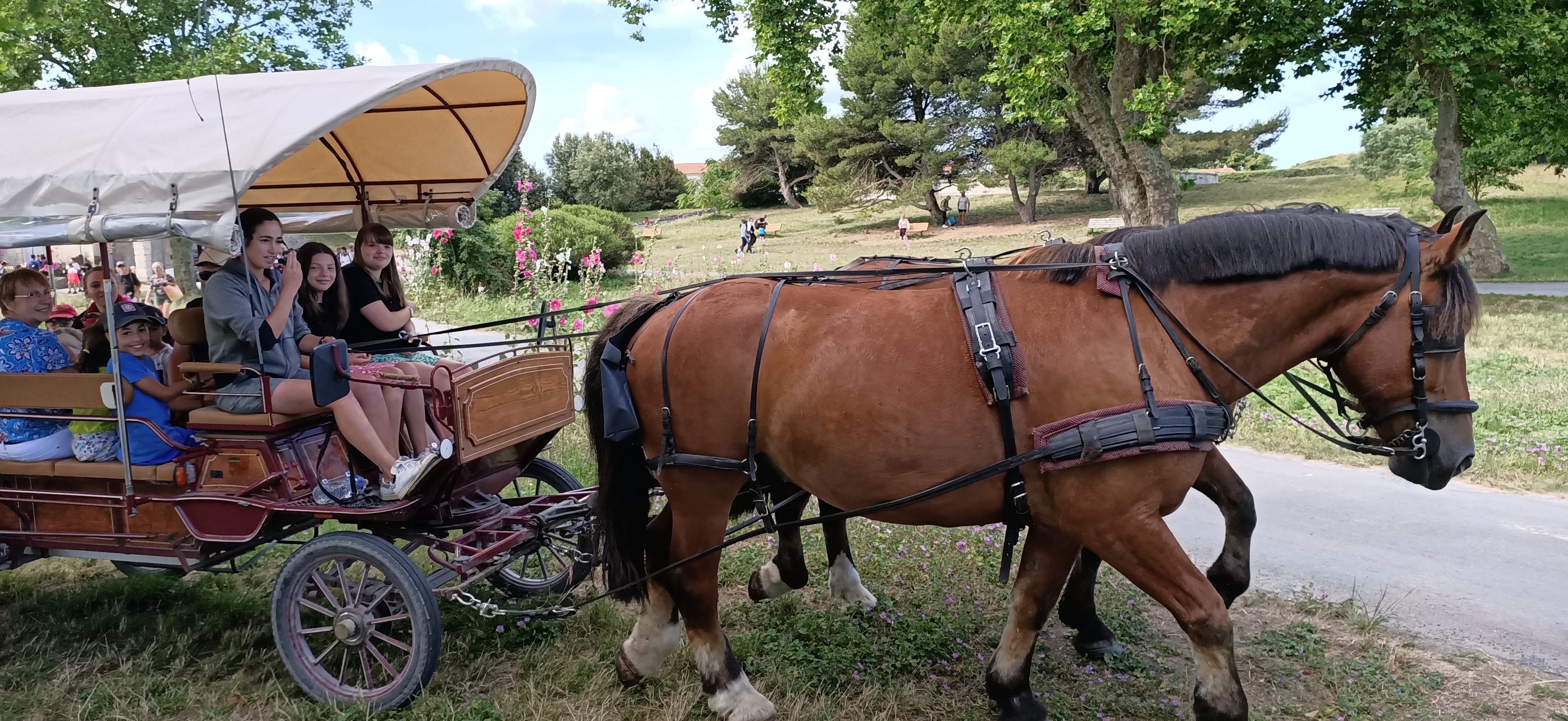 Posté le 03/07/2023 à 18:19"Super promenade et dépaysement la cochère très sympa et beaucoup d'humour et merci au deux chevaux Apollon et Velours (visite du 6 juillet )de nous avoir fait découvrir cette magnifique île."