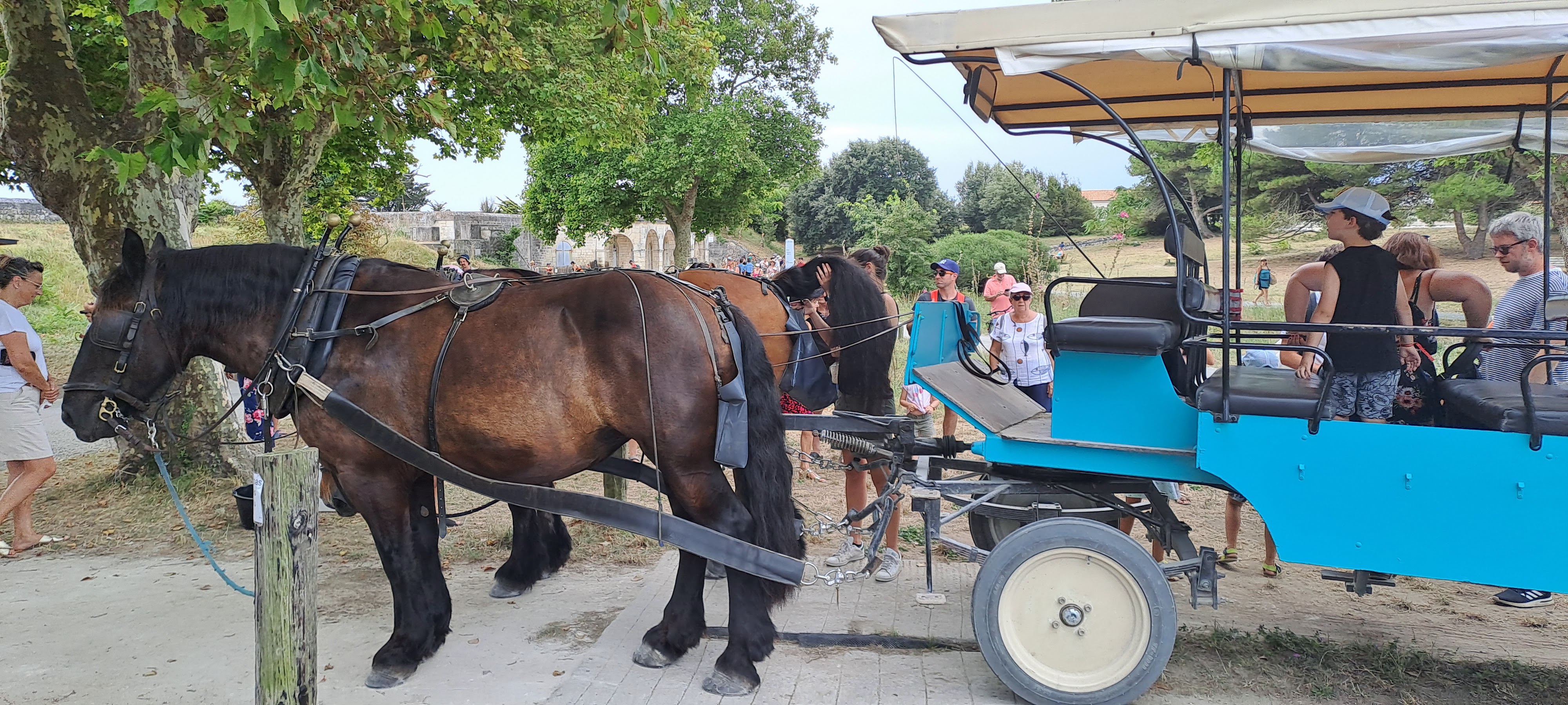 Posté le 25/06/2023 à 16:31"Je recommande vivement le tour de l'île en calèche. Notre cocher nous a présenté l'île et a répondu patiemment et avec beaucoup d'humour à toutes nos questions, y compris sur les superbes juments, Eva et Bella. Pour les amis des animaux, les chevaux travaillent par roulement, stationnent à l'ombre, sont abreuvés systématiquement et sont chouchoutés par leurs cochers. D'ailleurs, il est interdit de les caresser pour qu'ils soient au calme. Ben oui, c'est essentiel de voir le bien-être des animaux respectés ! Merci les calèches de l'île d'Aix ! ❤️❤️❤️"
